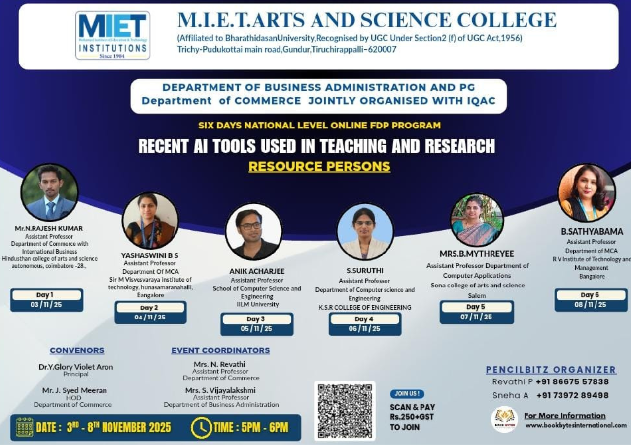 M.I.E.T. Arts College is committed to providing high-quality education, training, and research facilities in Arts and Sciences, leading to doctoral degrees under recognized affiliating bodies. The college is dedicated to achieving excellence in all aspects of education and fostering the holistic growth of students to meet global challenges.