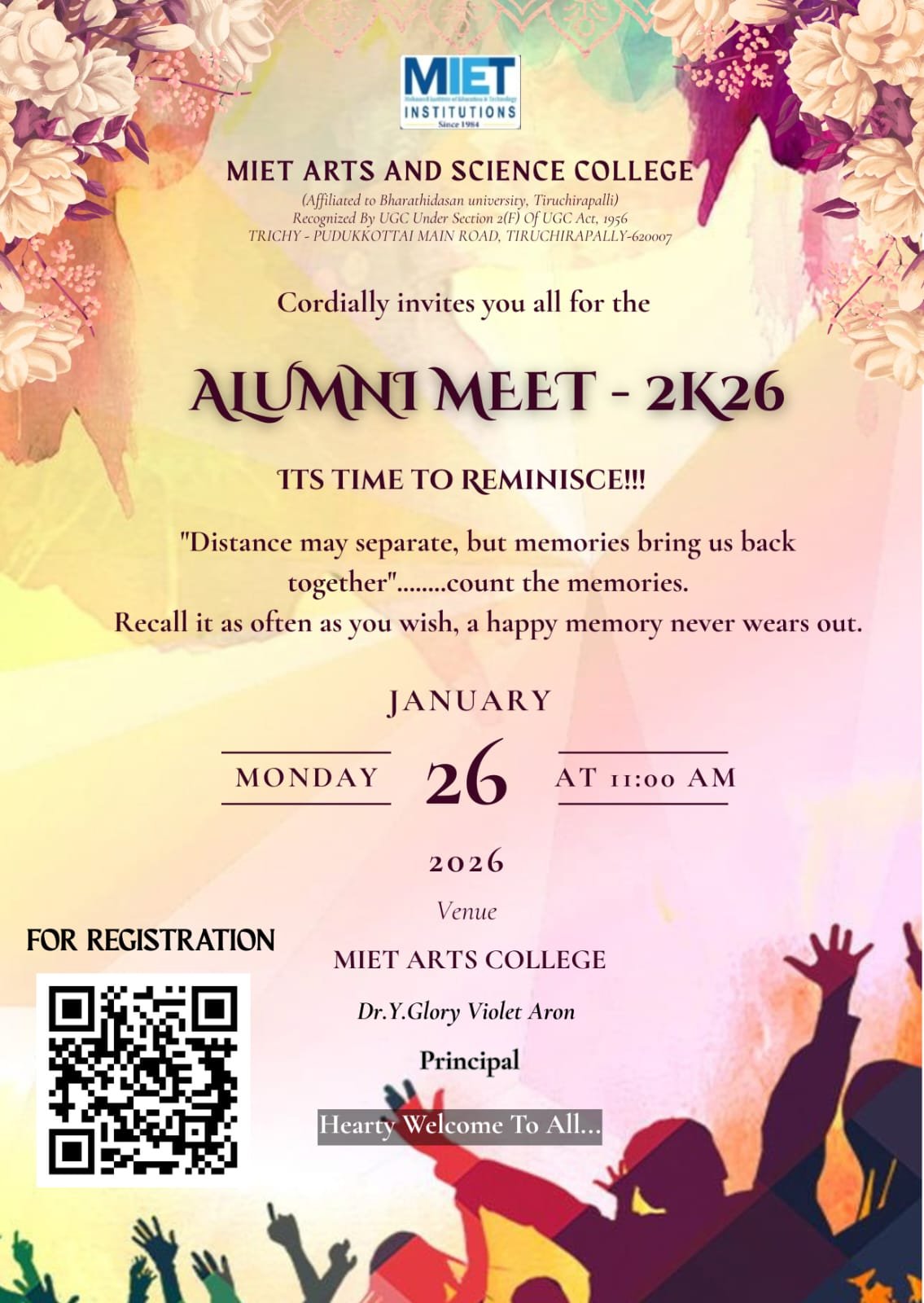 M.I.E.T. Arts College is committed to providing high-quality education, training, and research facilities in Arts and Sciences, leading to doctoral degrees under recognized affiliating bodies. The college is dedicated to achieving excellence in all aspects of education and fostering the holistic growth of students to meet global challenges.