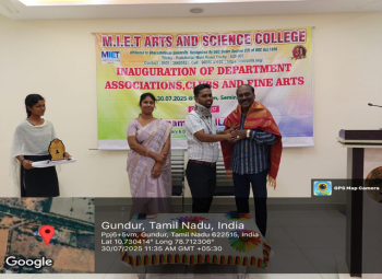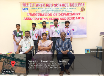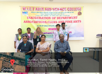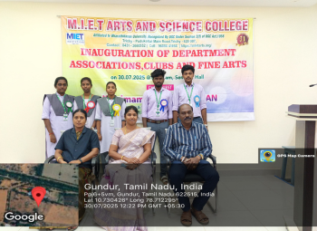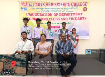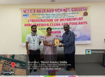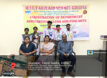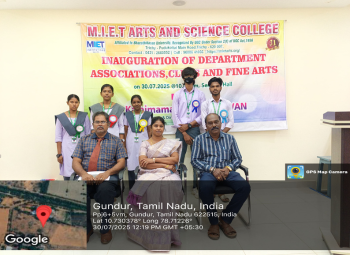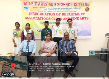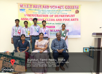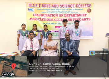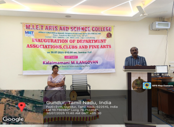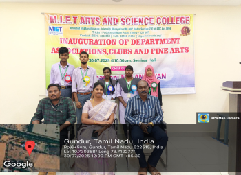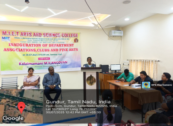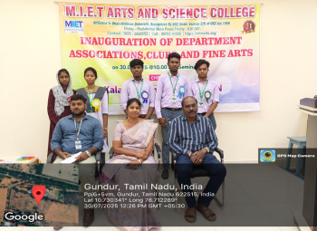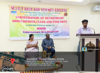 M.I.E.T Arts and Science College Trichy, various DEPARTMENT ASSOCIATION, CLUBS and FINE ARTS association was inaugurated in the most admirable and efficient manner. The Association Inauguration was held on 30th JULY 2025 at 10AM in Seminar hall. The Presidential Address is given by the Principal of the college Dr. Y. Glory Violet Aron. The Department Association, Fine Arts and Clubs was inaugurated by M. ILANGOVAN Secretary & Director, Kavin Kalai Kuzhu, Trichy. All the students of the Department, Clubs and Fine Arts have showed their willingness in participating in the inaugural ceremony and making it an Enormous success. With the enthusiastic participation of 120 dedicated students of M.I.E.T Arts and Science College were participated. Association Names and Association members were Introduced by the Head of the Department.