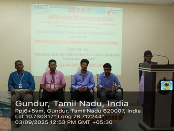 “ DIGITAL AGE ON CYBER SECURITY AND HAND ON TRAINING SESSION “ was organized by Department of computer applications. It was conducted on 03.09.2025 at 10.00am for UG & PG II and III year students had actively participated. This seminar on Cyber security was organized by the college to raise awareness and educate students about the risks associated with cybercrime and the measures that can be taken to prevent such activities. The seminar aims to educate participants about the importance of cyber security and how it can be used to protect sensitive data and information. He also gave relatable real-life examples about how people have been affected by hacking and other cybercrimes It discusses several key topics related to cyber security including cybercrime, challenges of cyber security like network security and data security, common cyber threats like hacking, phishing, and malware, and ways to avoid cyber attacks such as using antivirus software and firewalls. It provides an overview of important concepts regarding cyber security risks and protective measures. The session was indeed useful and informative for students as they gained knowledge about topics that they were not really exposed to in their curriculum.