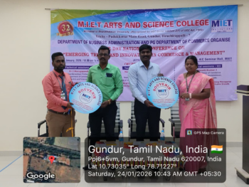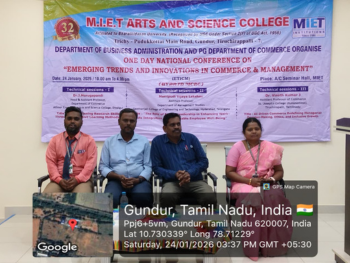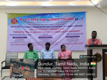 M.I.E.T Arts and Science College, Trichy -7. The Department of Business Administration and PG Department of Commerce conducted One Day National Conference on “Emerging Trends and Innovations in Commerce & Management (ETICM)” (Hybrid Mode) At 24 January 2026 (Saturday) In this session college principal Dr.Y.Glory Violet Aron have delivered presidential address and convenor J Syed Meeran (HOD department of commerce) delivered inauguration address of this conference and resource persons handled the following sessions... Technical Session Titles: Strengthening Research Skills Through Innovative Learning Methods The Role of Ethical Leadership in Enhancing Work–Life Integration for Sustainable Employee Well-Being AI-Driven Commerce: Redefining Managerial Decision-Making, Ethics, and Inclusive Growth Various college students and research scholars have participated And benefited From this conference