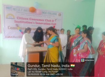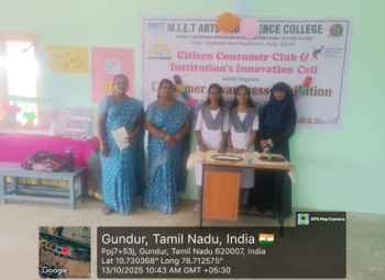 The Citizen Consumer Club (CCC) of MIET arts and science college organized an Exhibition on Consumer Awareness as a part of the Saaral Competition on [13/10/2025] at the room no S22. The objective of the exhibition was to create awareness among school students about their rights and responsibilities as consumers and to promote fair consumer practices in day-to-day life. Various informative charts, models, and posters were displayed highlighting topics such as: Consumer rights and duties, Standardization marks (ISI, AGMARK, FPO, Hallmark, etc.) Misleading advertisements, Online consumer frauds and precautions, Eco-friendly consumption and sustainable living More than 200 school students from different schools participated and visited the stalls. The students interacted enthusiastically with the CCC members and gained practical knowledge about consumer protection laws and grievance redressal mechanisms. Demonstrations and question–answer sessions were also conducted to engage the visitors. The event was inaugurated by Dr. Y.Glory Violet Aron Principal of MIET arts and science college who appreciated the efforts of the students and faculty for spreading awareness on consumer issues.