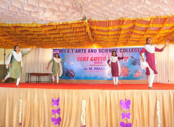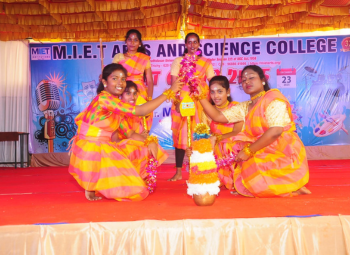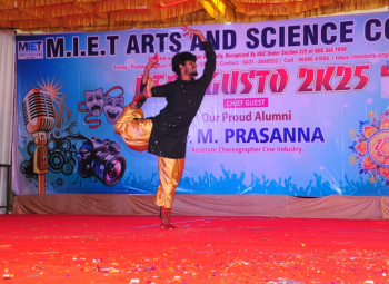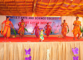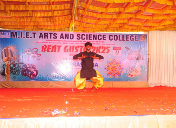 On the occasion of the Cultural Programme, MIET Arts and Science College organized a vibrant cultural function “BEAT GUSTO 2k25” was held on 22.12.25 & 23.12.25.It was a two days programme. The theme of the day was “enthusiasm, energy, and great enjoyment in doing something” that showcased the talents and enthusiasm of the students. The event took place in the college ground which was beautifully decorated to create a festive atmosphere.The Cultural Programme Presided over by the Principal of the college Dr.Y.Glory Violet Aron by inspiring the students to hold on to the positive energy and to always strive towards excellence. The special guest Mr.M.PRASANNA Alumni of our college. DAY ONE: Inauguration, Various Competitions. DAY TWO: Cultural Programme, Prize Distribution